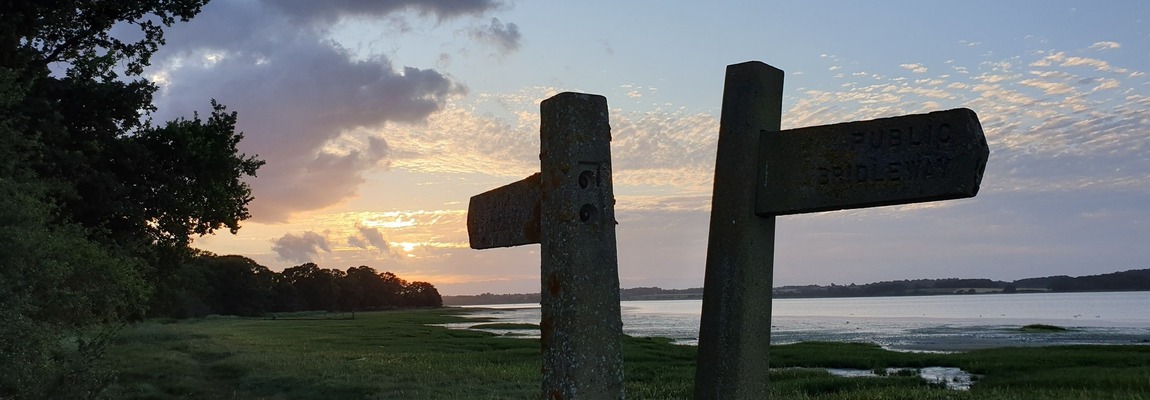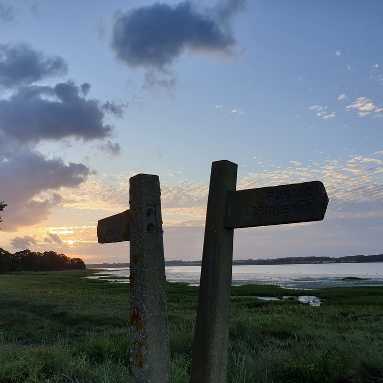 Fingerposts by river shore, Bradfield, Essex, River Stour